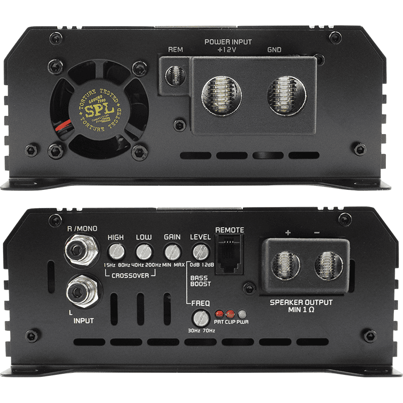 1-Kanal 1-Ohm stabiler Breitband SPL-Hochleistungsverstärker mit Class D Schaltung, integrierter Aktivweiche und Bass Boost