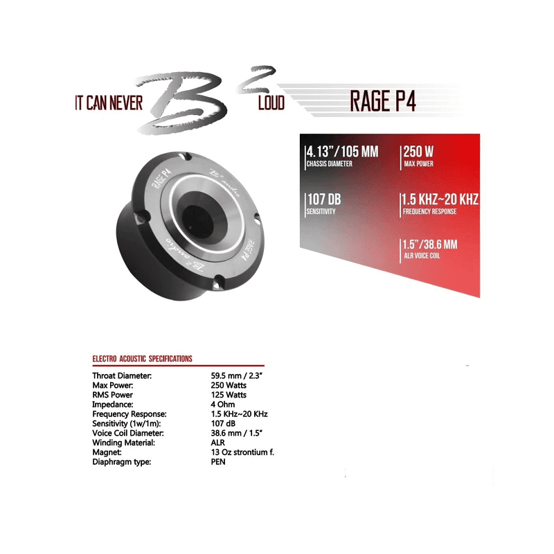 Die Rage-Serie von B² Audio vereint Preis & Leistung auf höchsten Niveau. Eine Serie die optisch, technisch und funktionell einen sehr hohen Standard erfüllt. Die Pro Audio Hochtöner setzen einen neuen Maßstab im Alltag für den Bassverrückten.