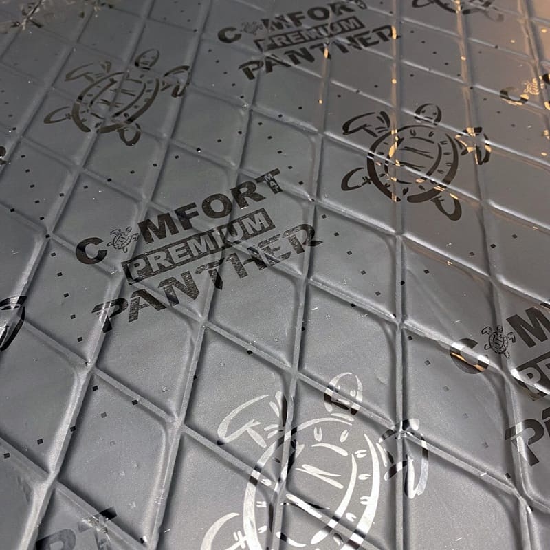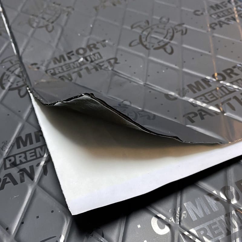 Alubutyl für Bereiche mit mittleren Vibrationsbelastungen. Universelles vibrationsdämpfendes Material mit einer Dicke von 2,5 mm, hat eine sehr gute Haftung auf Metall und Kunststoff. Das Material besteht aus einer Mischung spezieller Butyl-Polymere, die mit Aluminiumfolie verstärkt sind. Die Verwendung eines modifizierten Elastomers in der Zusammensetzung der dämpfenden Schicht verleiht dem Material einen guten mechanischen Verlustfaktor, eine gute Haftung, Beständigkeit gegen Umwelteinflüsse und einen breiten Temperaturbereich. Die Matten der PANTHER-Serie sind wasserbeständig, sie haben Dichtungs- und Korrosionsschutzeigenschaften und müssen während der Installation nicht erwärmt werden. Durch die mittlere Prägung sind die Matten auch bei komplexen Formen noch gut zu Verarbeiten.