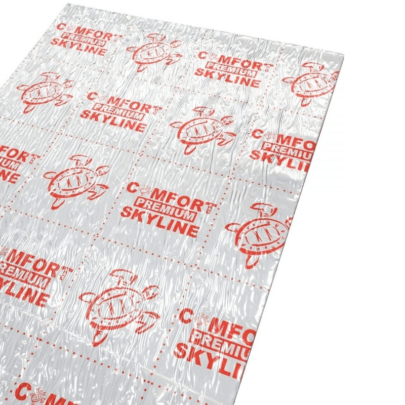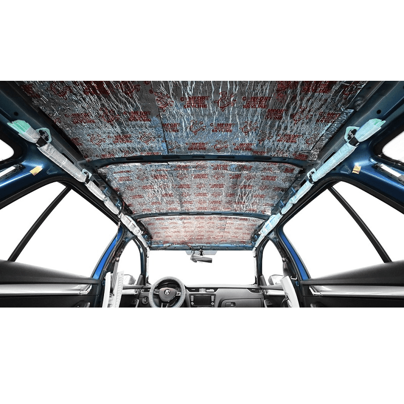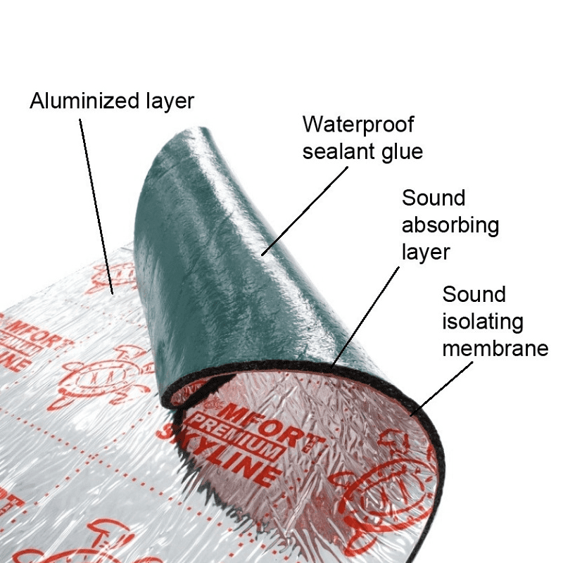 Die abschließende aluminierte Schicht ermöglicht es, eine hohe Haftung für die nächste Schicht zu erzielen. Wir empfehlen einen weichen Schallabsorber zu verwenden, um das beste Ergebnis zu erzielen. Dadurch haben wir eine sehr einfache Installation, absolute Feuchtigkeitsbeständigkeit und hohe Haftung auf vertikalen Flächen. Durch den leichten Aufbau ist es ideal auf dem Dach eines Autos zu verwenden.