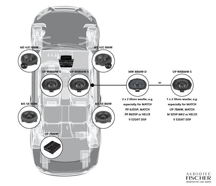 Dank der BMW-spezifischen Lautsprecherkörbe und Plug & Play Steckverbinder ist ein schneller und einfacher Verbau in die ab Werk vorgesehenen Einbauplätze aller BMW-Modellreihen mit Untersitz-Subwoofer möglich.