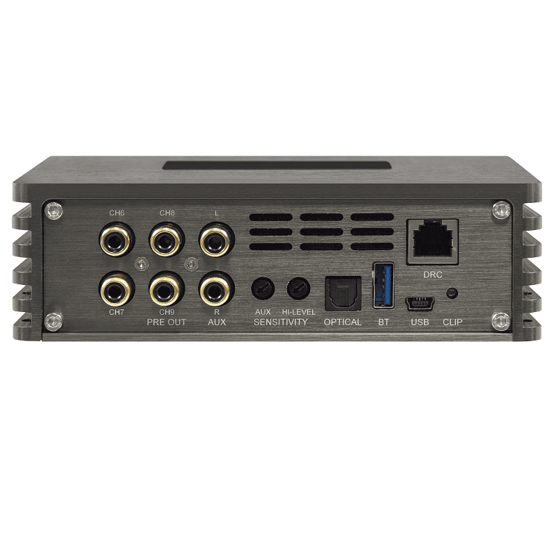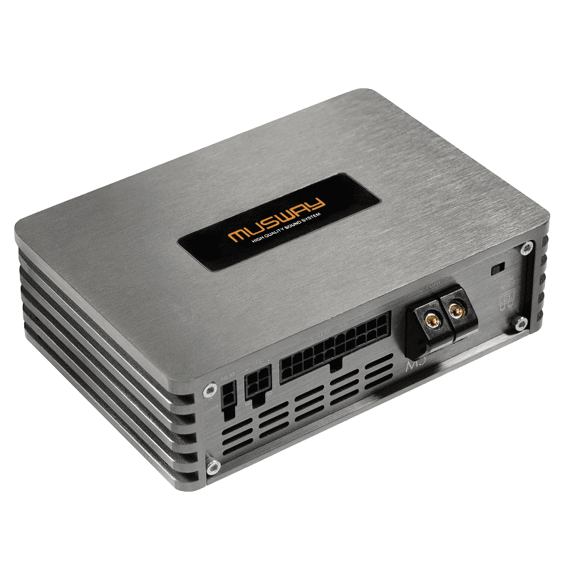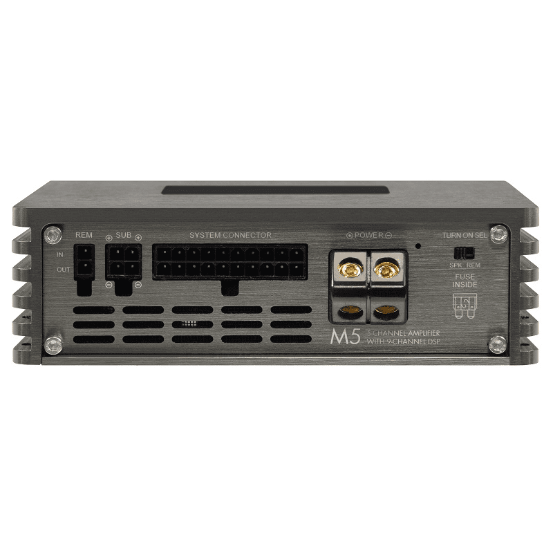 Den neuen M5 Evo DSP Verstärker kann man als den kleinen Bruder des M6 Pro Modells ansehen. Der einzige Unterschied besteht darin, dass der M5 mit 5 verstärkte Kanäle und insgesamt 8 prozessorgesteuerten Kanälen ausgestattet ist und der M6 Pro insgesamt 6 verstärkte Kanäle und 10 prozessorgesteuerte Kanäle besitzt. Beide Modelle teilen sich auch die sehr kompakten Gehäuseabmessungen, ermöglicht durch die raffiniert konstruierte 4-fach kaschierten Platine. Die neuartig konzipierte Class D Technologie ist besonders gegen EMV-Störungen gefeit, was heutzutage in modernen und mit elektronischen Bauteilen vollgestopften Fahrzeugen nahezu unabdinglich ist, um störungsfrei Musik beim Fahren genießen zu können.
